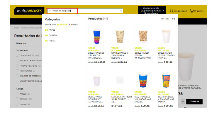 1- Podrás usar nuestro buscador y escribir el producto o la categoría que estás buscando, automáticamente se desplegará una lista con los artículos correspondientes a tu búsqueda.