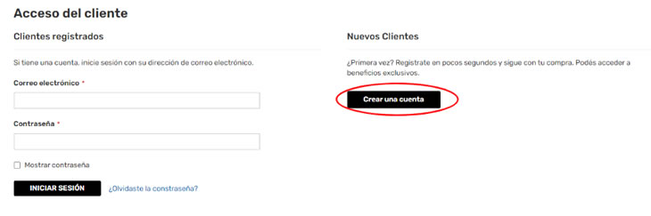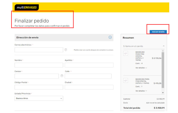 4- Para finalizar el pedido solo faltará completar tus datos personales, de envío y método de pagos. En caso que te hayas registrado previamente tendrás la opción de "INICIAR SESIÓN".