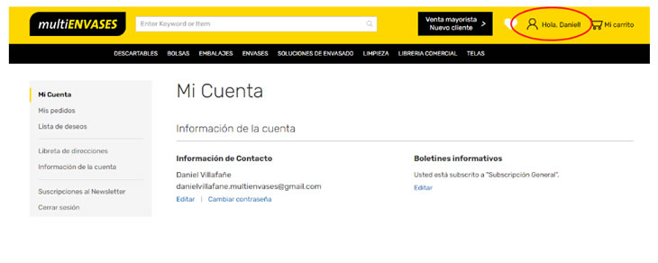 2- TU NOMBRE aparecerá en el margen superior derecho, una vez realizado este paso aparecerán las promociones de envios correspondientes a tu categoría de cliente, avances de tu compra e historial de tus intereses. Haciendo un click en "TU NOMBRE" accederás a un panel personalizado de tu historial y tus intereses.