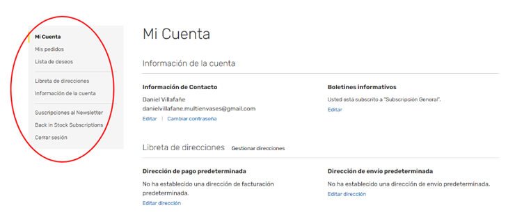3- Una vez que ingreses a la sección "MI CUENTA" podrás tener un seguimiento de tu comportamiento dentro de la WEB, comprobar el estado de tus pedidos, observar tus pedidos anteriores e incluso y enterarte si un producto de tu interés vuelve a tener stock, cambiar tu contraseña y configuración de tu cuenta en general, asegurando una experiencia personalizada.
